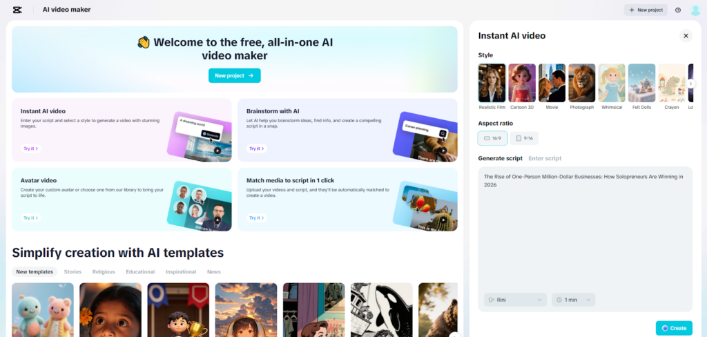 Step 1: Activate the Auto-Scene Generator Start by opening the CapCut online video editor and moving to the main dashboard. Click “Free AI video maker” to instantly access all AI-powered video creation tools. Choose “Instant AI video” to begin creating scenes without uploading any footage.